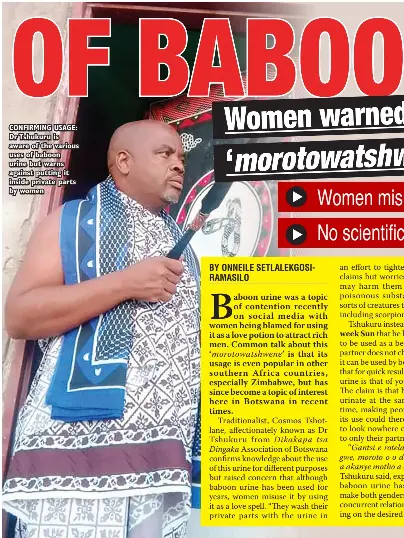 Tshukuru instead told The Midweek Sun that he knows the urine to be used as a belief, to ensure a partner does not cheat, adding that it can be used by both genders and that for quick results, the preferred urine is that of younger baboons. The claim is that baboons usually urinate at the same spot all the time, making people believe that its use could therefore make one to look nowhere else for love but to only their partner.